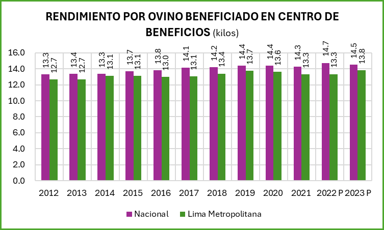 Según las cifras oficiales, se beneficiaron en centros de beneficios 538.577 ovinos el año 2023, un 5,47 más que lo correspondiente al año 2022, representando esa cifra solamente el 4,79% del total de ovinos beneficiados el año 2023 Como se puede ver en el gráfico siguiente, el rendimiento de los ovinos beneficiados en centros especializados es mayor al rendimiento nacional, siendo el rendimiento en los centros nacionales mayor que el de Lima Metropolitana en 0,77 kilos en promedio para la serie de datos de la gráfica.